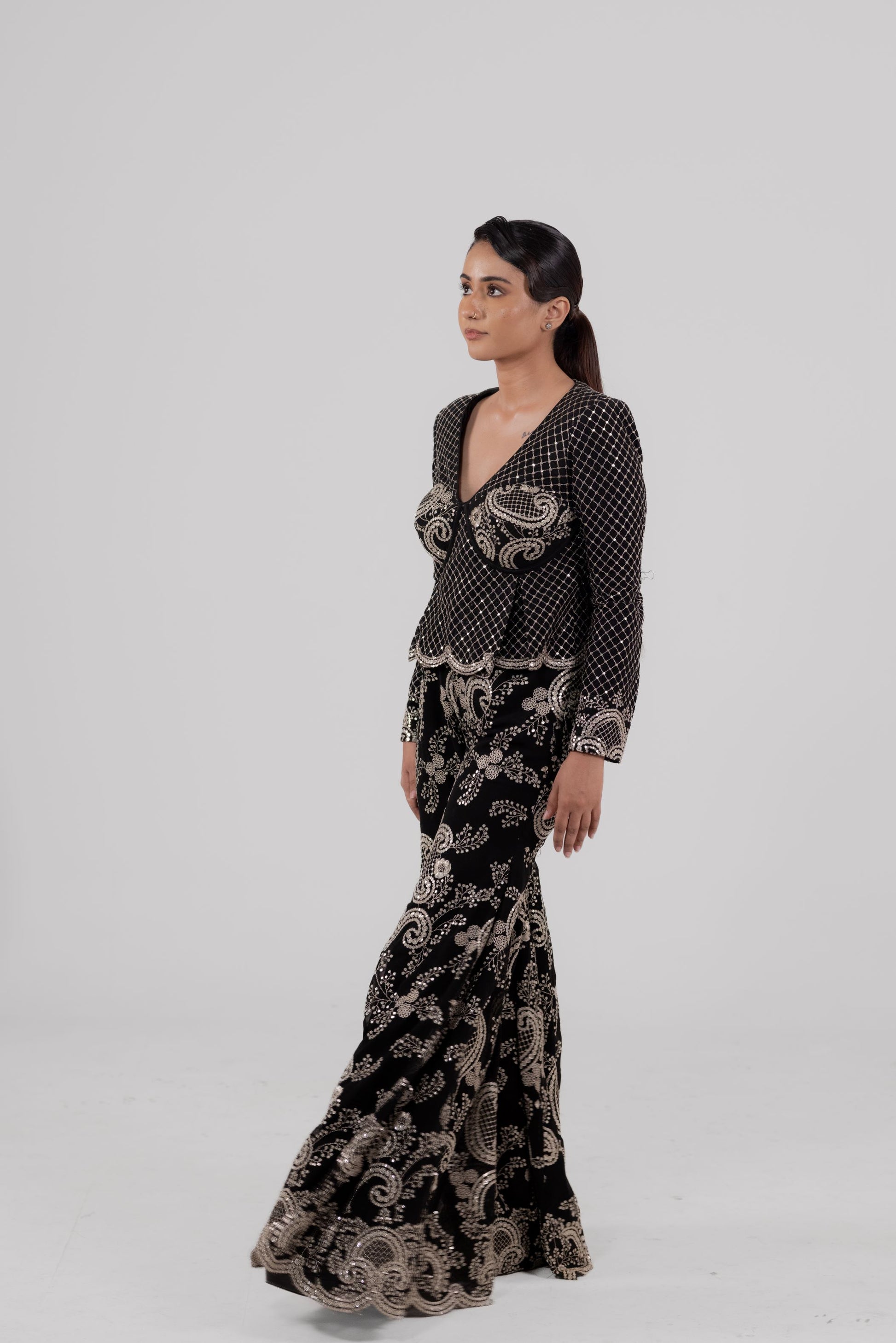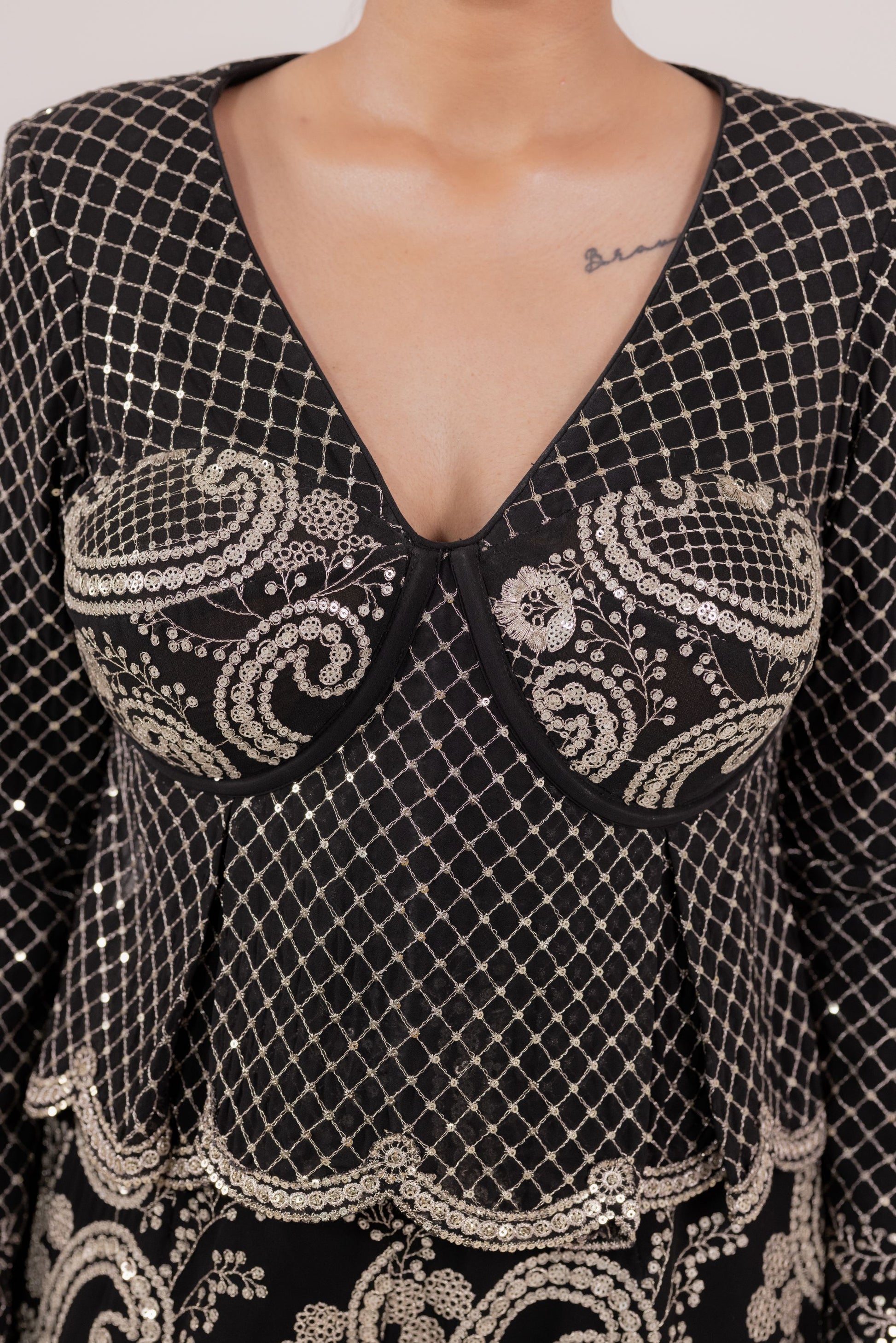 Elegance meets structure in this black georgette peplum with under-bust bone, box pleats, shoulder pads, and scalloped edges. Comes with flared bell-bottom pants to elevate the silhouette—crafted with zari machine embroidery and sequin detailing.