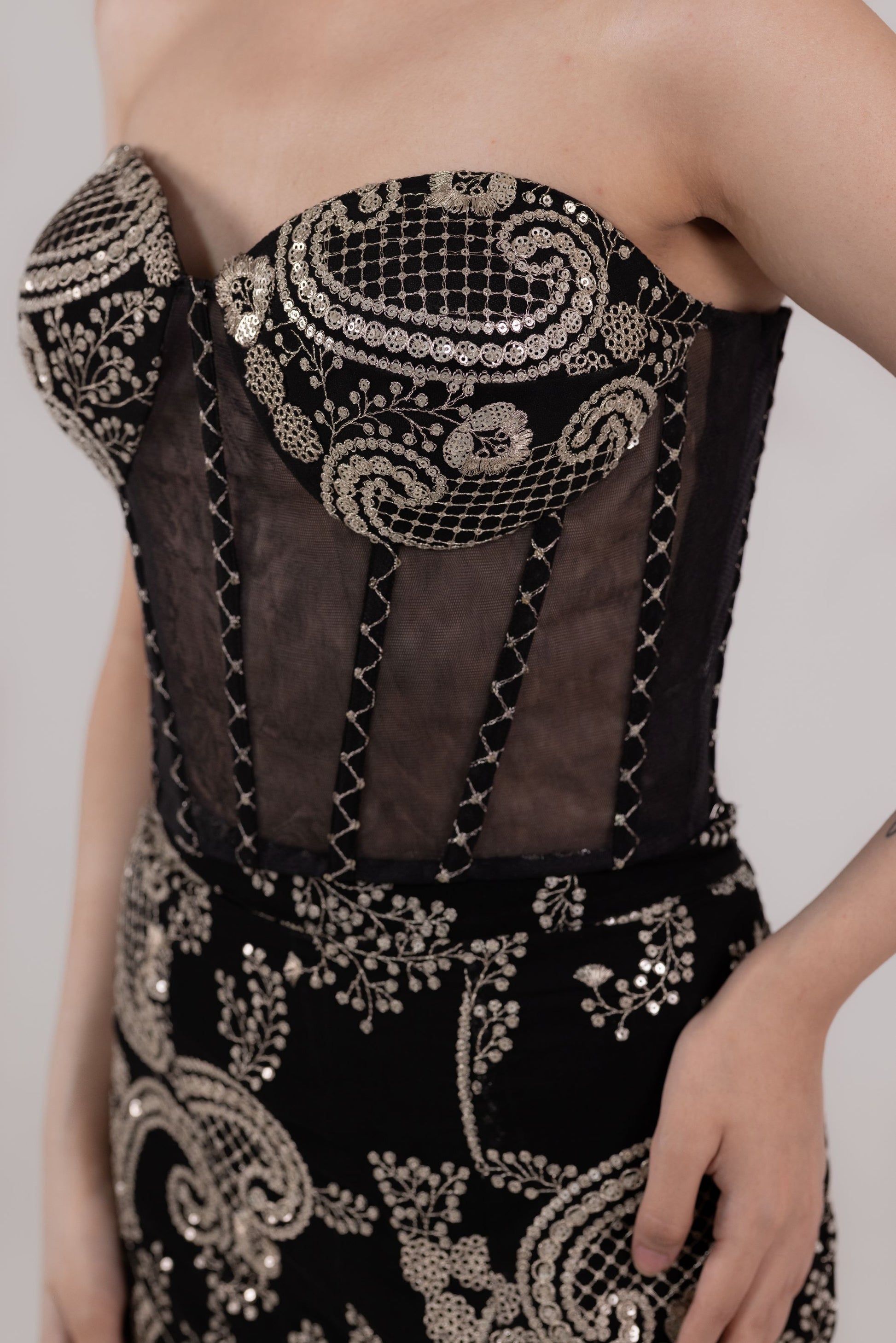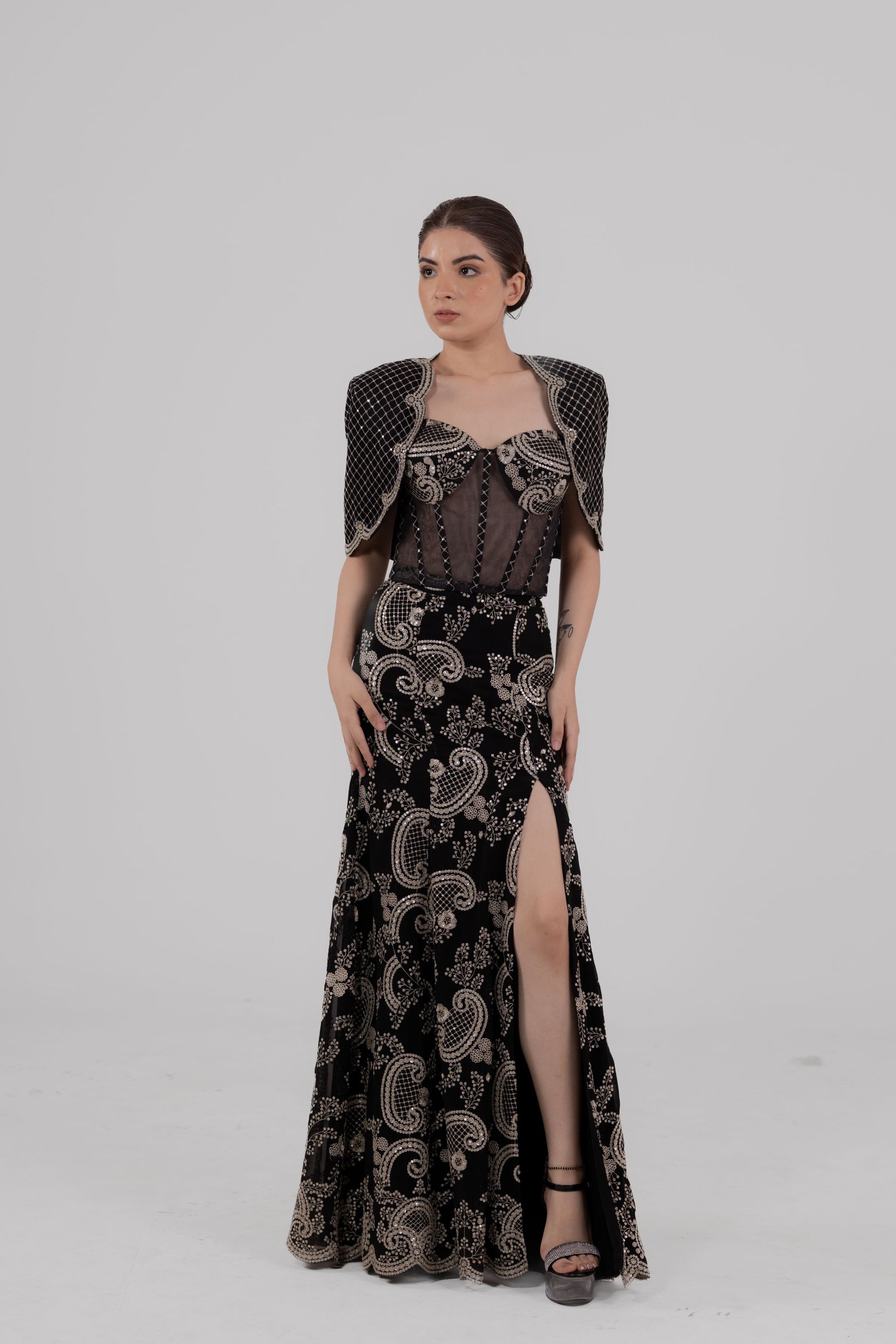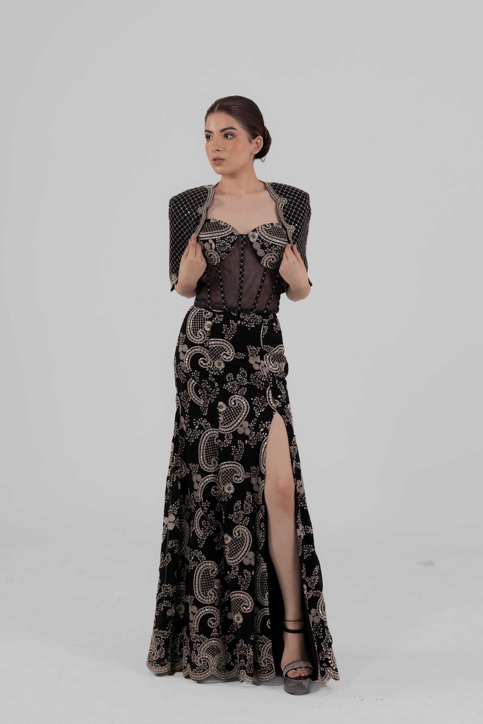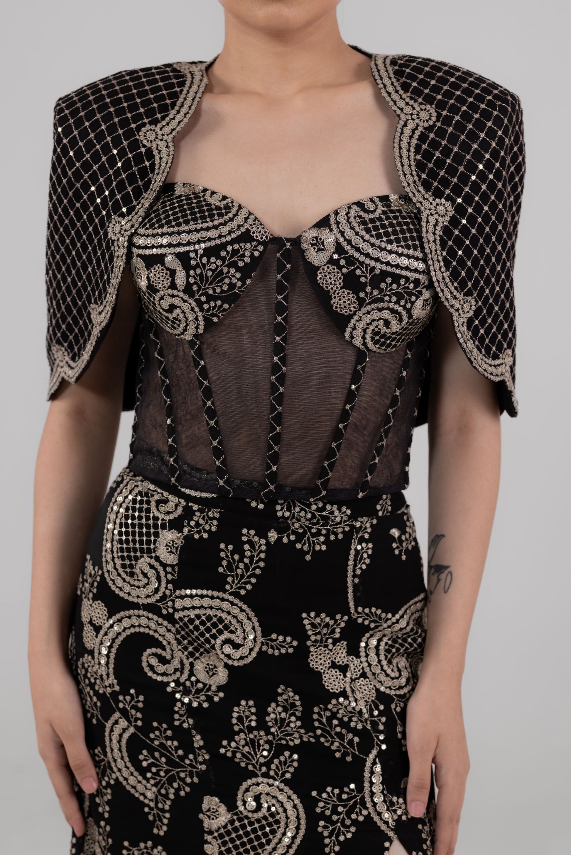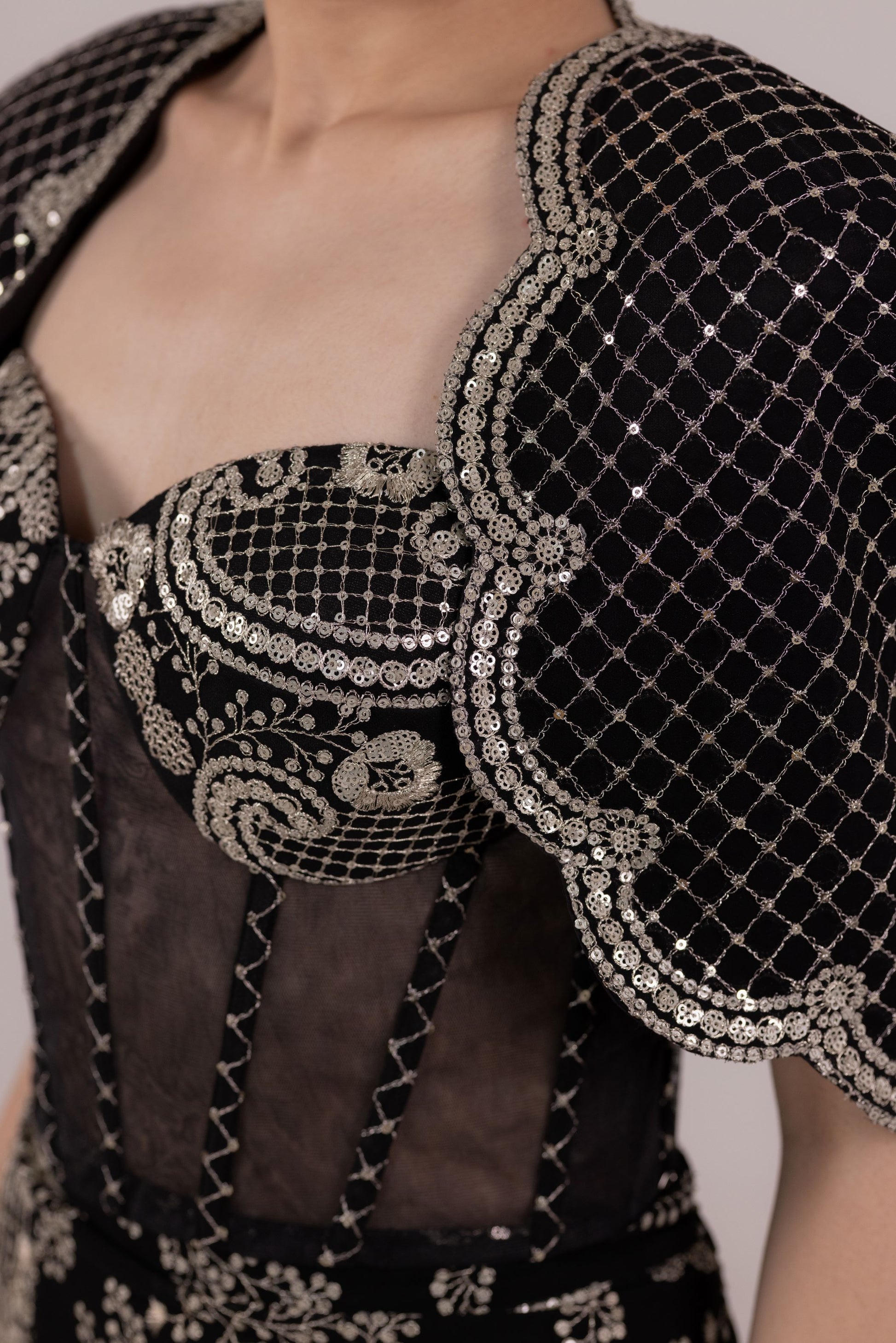This sheer double-net corset with a metal zipper back is drama personified. It’s layered under a structured padded-shoulder cape with scalloped edges, and finished with a fish-cut slit skirt in black georgette with zari and sequin accents.