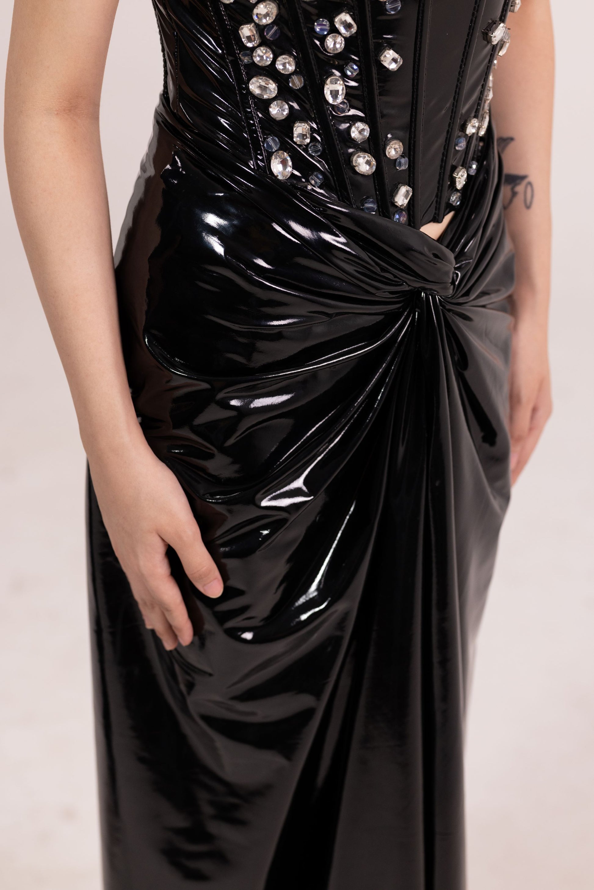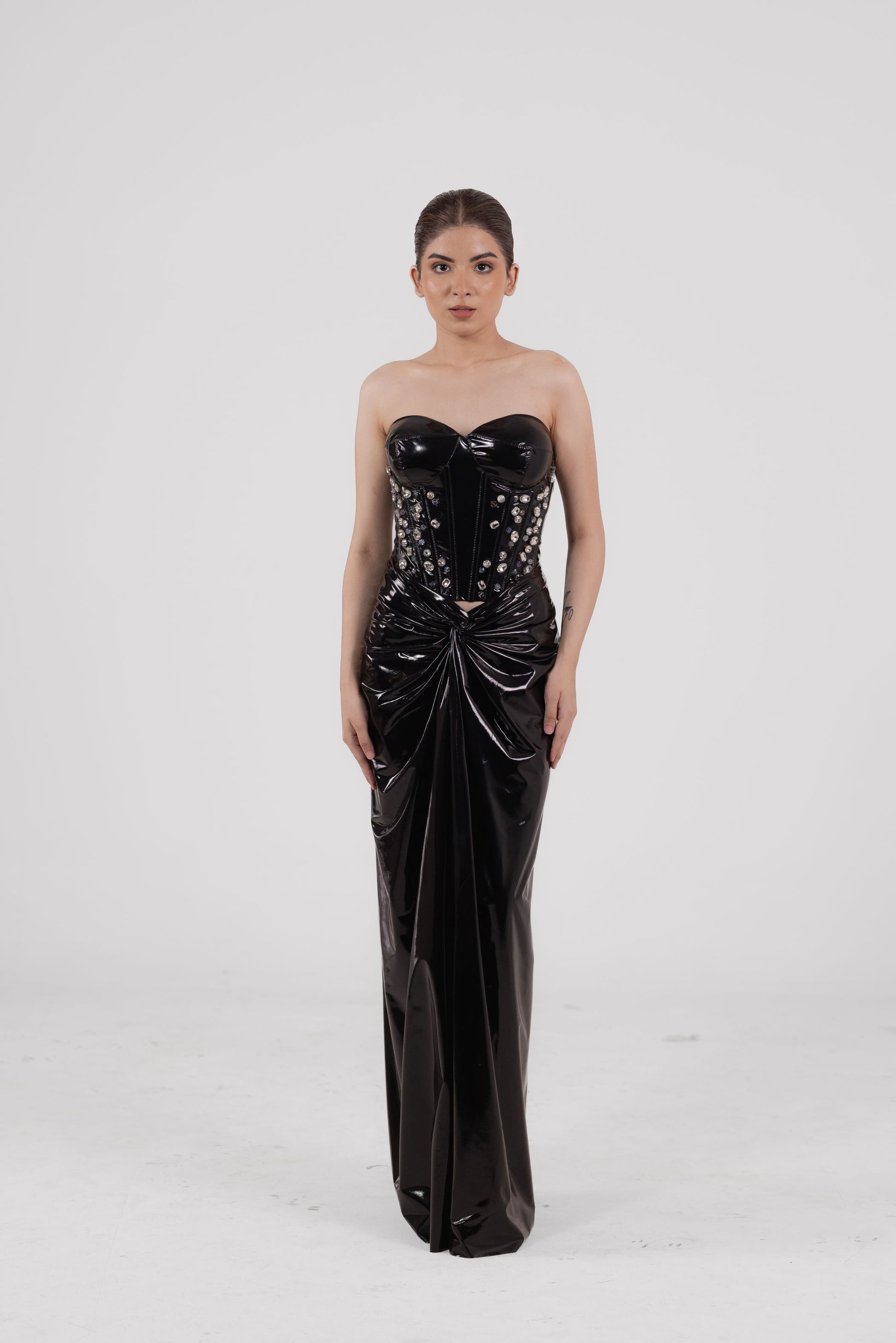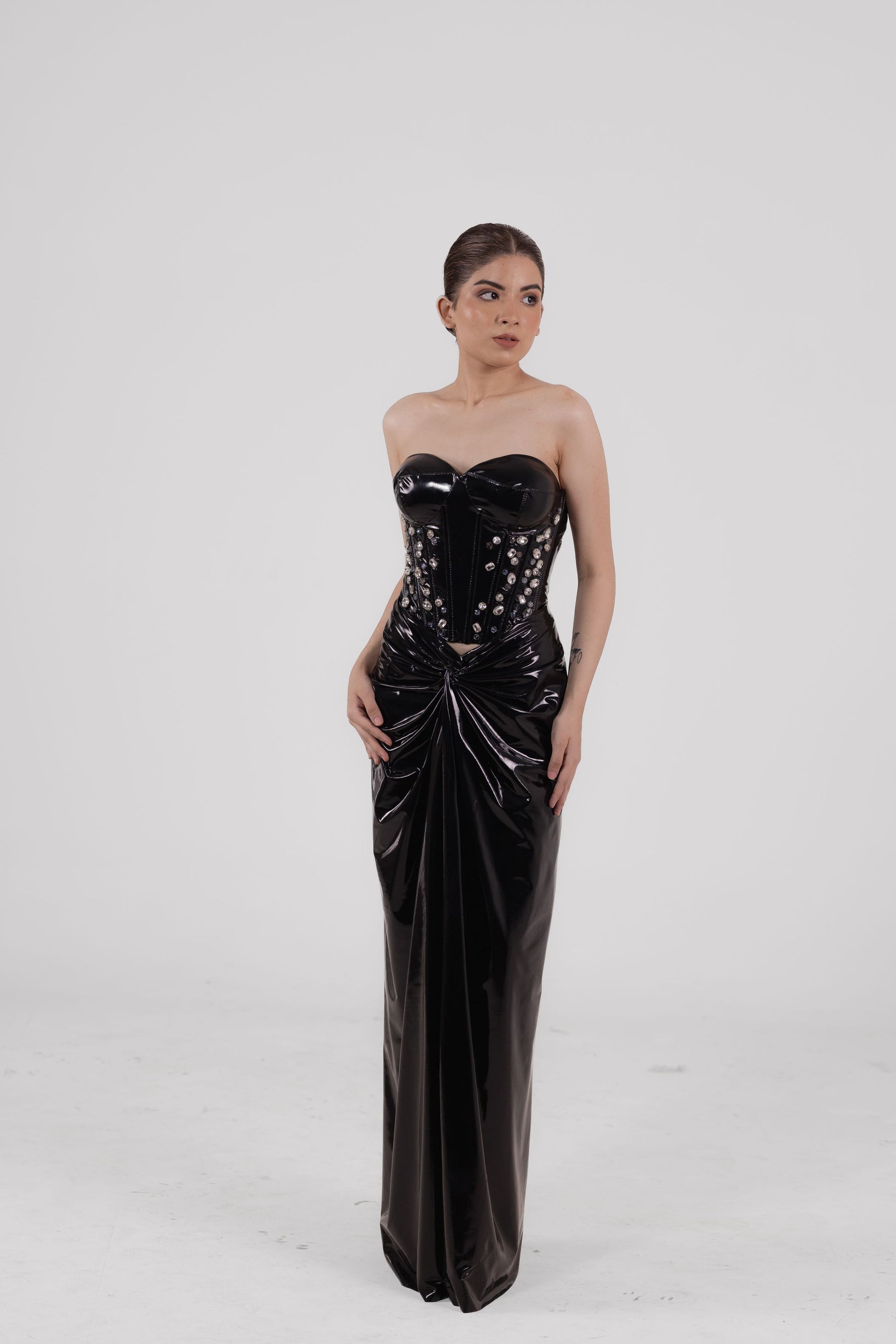 Fierce and form-defining, this latex bustier with padded shoulders exudes power. Studded hand embellishments on the shoulders add a glint of attitude. The high-waisted asymmetric skirt features a yoke and bold side slit—turning heads with every step.