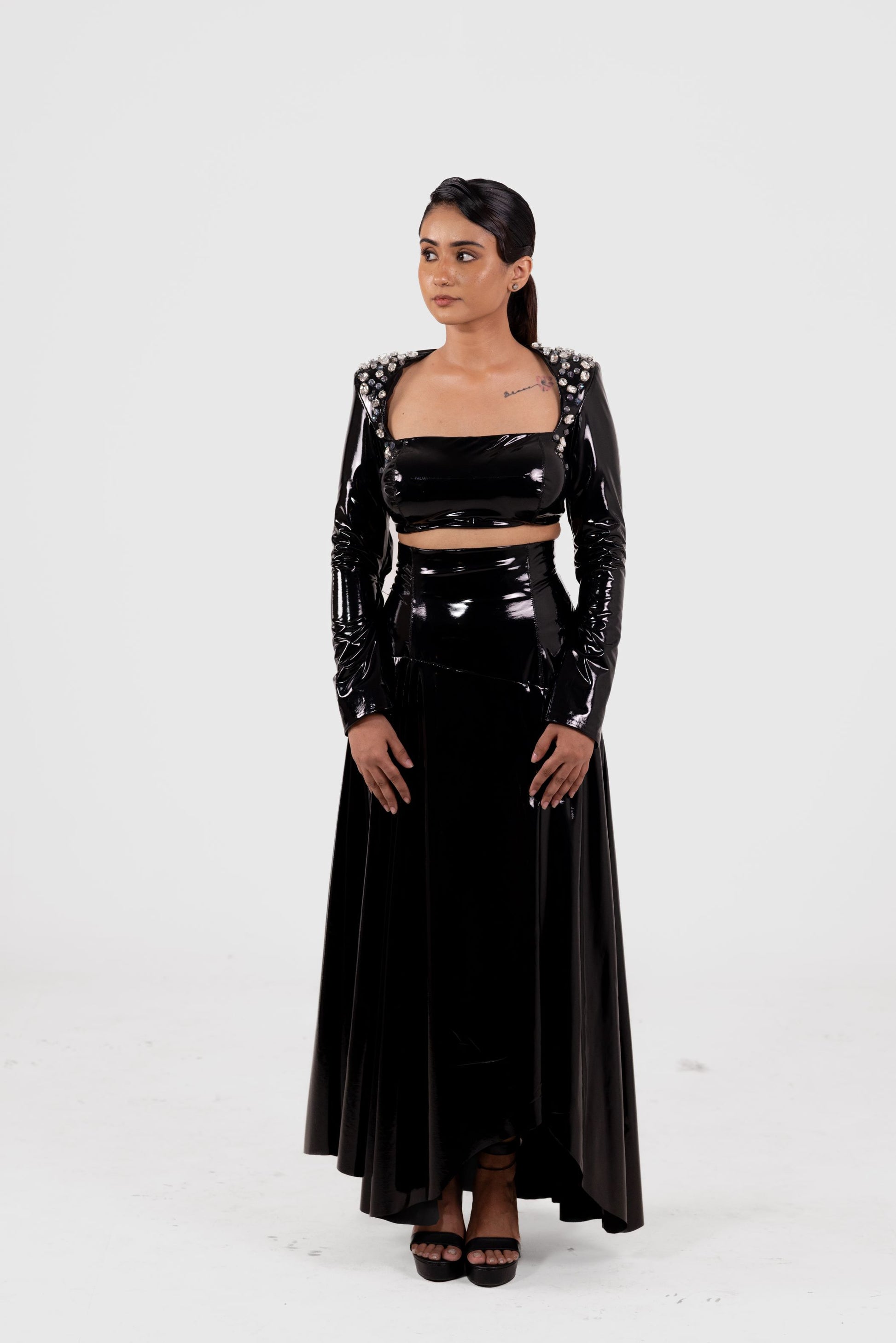 This daring latex corset is encrusted with hand-placed crystal studs and a criss-cross back, built for bold silhouettes. Paired with a draped front-slit latex skirt, this look owns the room with avant-garde allure and unapologetic edge.