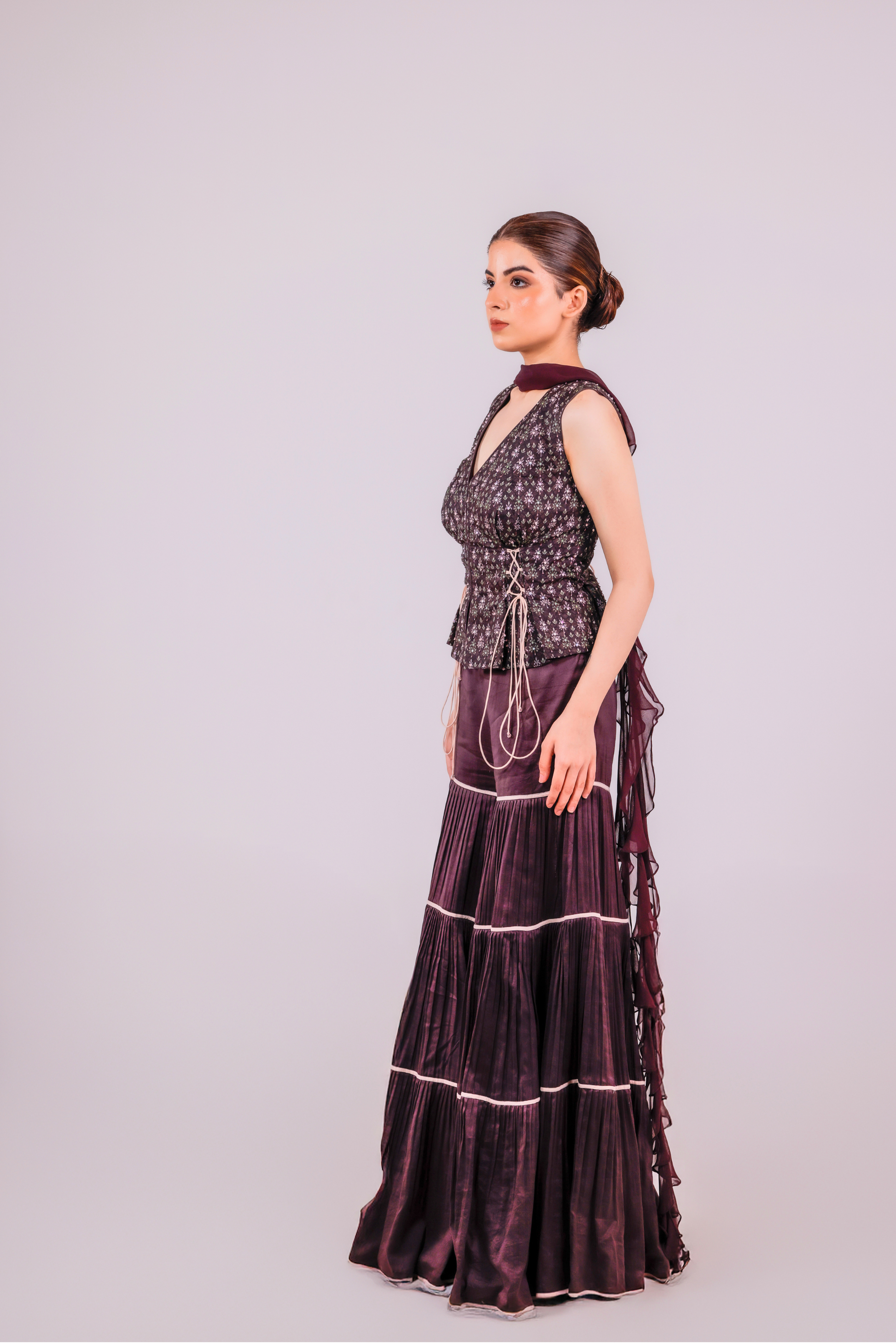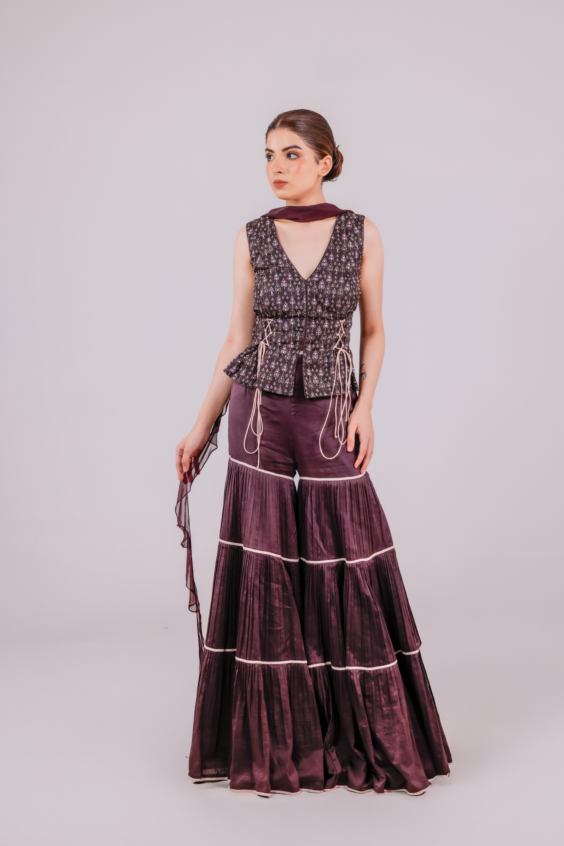 This printed structured silk top with sequin-bead detailing, cut sleeves, and non-functional drawstrings pairs beautifully with a high-waisted 4-layer chanderi sharara. Comes with a soft georgette ruffle stole to complete the look.