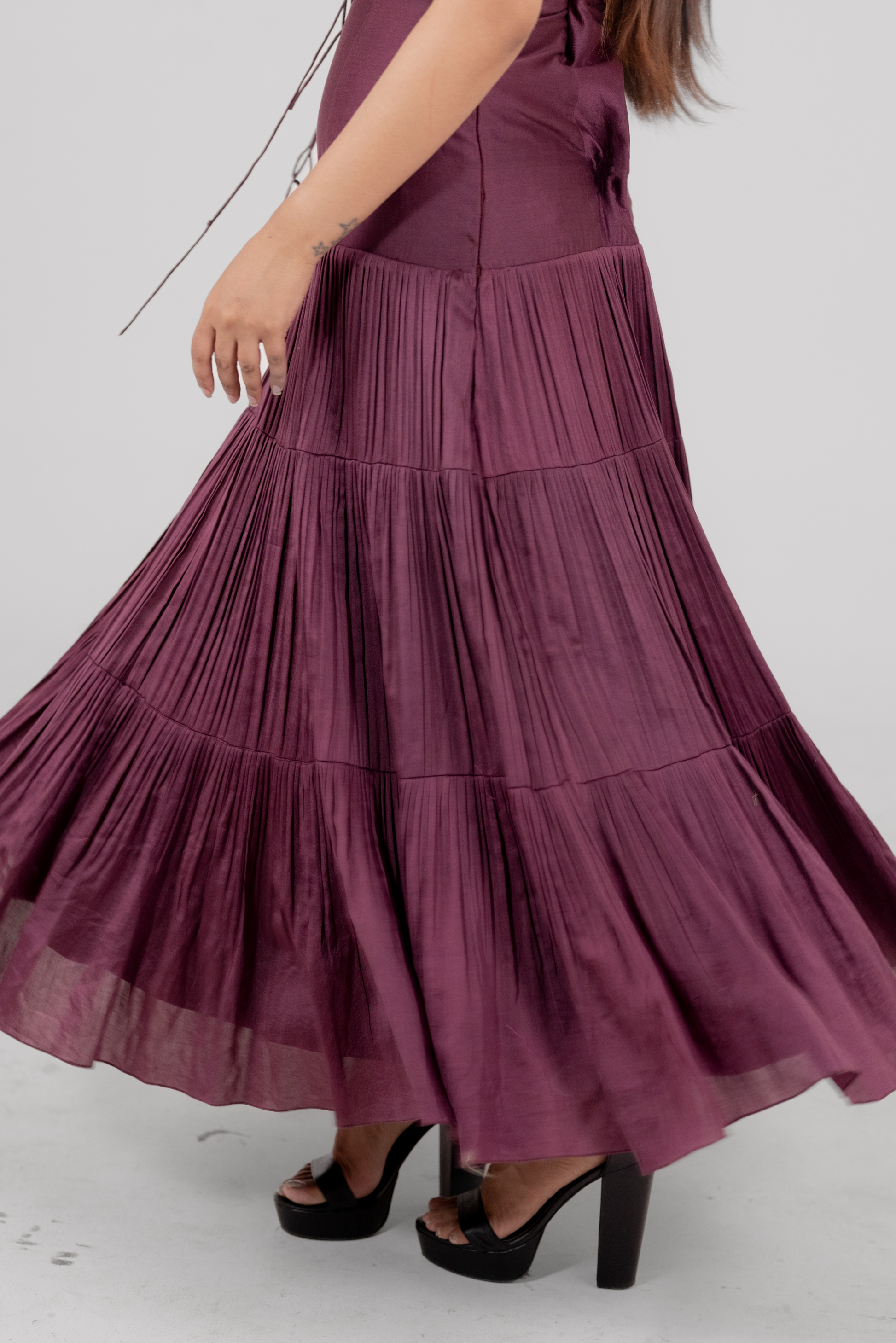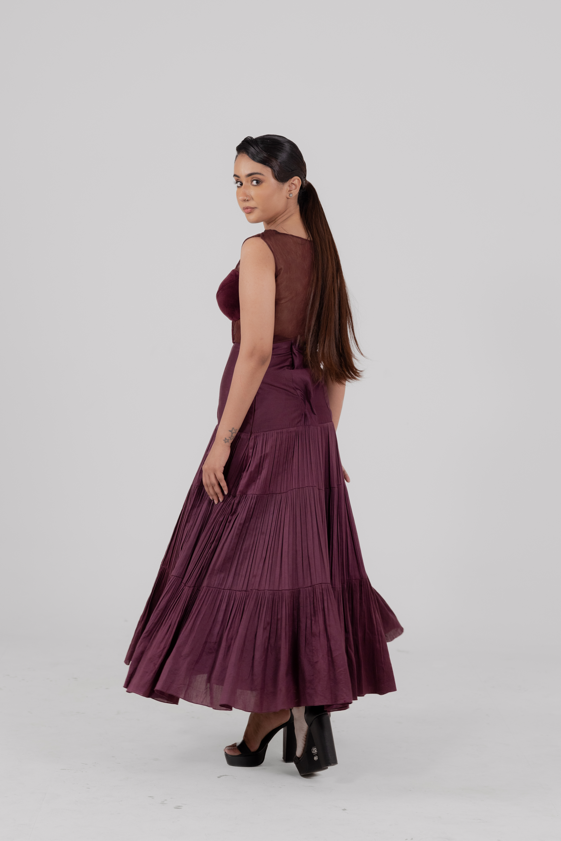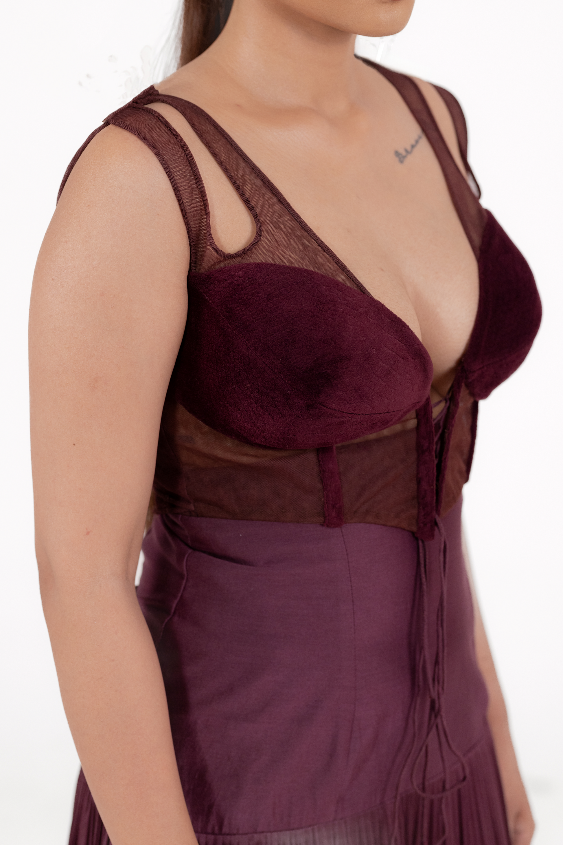 An architectural blend of textured velvet and sheer net, this butterfly corset jacket has a criss-cross front and a see-through back. It flows into a four-layer Victorian skirt made in rich pure Chanderi—grandeur with an edge.